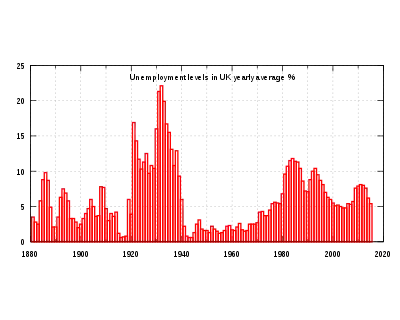 Data available from 1881 to 1912 is based on the records of trade unions that paid unemployment benefit to their members. In 1912 there were 1.4 million members of trade unions that paid benefits. This means the unemployment rates for this period are based on a very small section of the UK population at the time (mainly manual workers). The lowest unemployment rate recorded in this period was 1.4% in 1890 and the highest was 10.2% in 1892.[17]