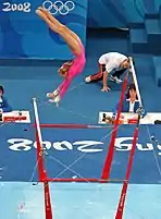 ![]() Karin Janz competing on the uneven bars at the 1968 Summer Olympics | |