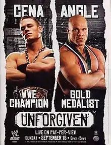 The main rivalry written into Unforgiven was between John Cena and Kurt Angle, who were competing for Cena's WWE Championship. At SummerSlam, Cena defeated Chris Jericho to retain the WWE Championship.[4][5] A rematch was held on the August 22 episode of Raw, one of WWE's primary television programs, when authority figure Eric Bischoff announced a match between Cena and Jericho in a "You're Fired" match, in which the loser would be fired. The match saw Cena win, and Bischoff was scripted to fire a pleading Jericho, who was carried out of the arena by security.[6][7] This angle was written after WWE's official website confirmed that Jericho signed a short-term contract extension to stay with the company after his long-term contract expired, which presumably ended after his loss to Cena. After the match,[8][9] Angle came down to the ring and attacked Cena with an Angle Slam. As Cena was down, Bischoff announced that Angle was the new contender for the WWE Championship, claiming that Jericho "couldn't get the job done".[6][7] Angle continued his attacks on Cena before their scheduled match at Unforgiven.[10][11][12] On the August 29 episode of Raw, Cena was scheduled in a Handicap match. He faced Tyson Tomko and Angle. Cena won the match by pinning Tomko after an FU. Afterwards, Angle assaulted Cena, which led to Angle being scripted to smash Cena's ankle across the ring post, thus giving Angle the advantage heading into Unforgiven.[12]