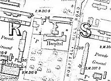 The hill the building is on was named 'Hospital Hill'. Because of its small size it could only accommodate the sick of two regiments and it quickly became apparent that the Union Building could not be a permanent hospital for the number of troops in Aldershot, so huts on the other side of Hospital Hill were utilised as additional hospital accommodation, together with further huts located in the North and South Camps.[15] The building of the Cambridge Military Hospital in 1879 made the Union Building redundant as a hospital and it became the District Pay Office. Later additions were added at the rear including extensions and additional floors.[1]