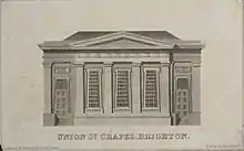 The building is a dominant presence on the north side of Union Street,[10] now a very narrow pedestrianised passage in the heart of The Lanes, the series of passageways lined with old buildings which formed the centre of the ancient village.[6] The tall, wide, stuccoed façade, facing south, is in the Greek Revival style, with Doric pilasters, a triglyph and a large pediment—in keeping with many of the Wilds–Busby partnership's Regency era buildings in Brighton; but the two doorways and three windows are tapered from bottom to top, a feature associated with Egyptian Revival architecture.[10][12][14][20] The roof is partly gabled.[1] The east wall, facing Meeting House Lane, pre-dates the 1825 work on the main façade; it consists of cobbled stonework and flints in a regular pattern, with red-brick dressings at the corners and around the arch-headed sash windows on the ground floor and the larger rectangular first-floor sash windows.[1][11]