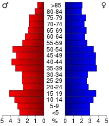 In the county, the population was spread out, with 23.30% under the age of 18, 8.70% from 18 to 24, 25.30% from 25 to 44, 24.00% from 45 to 64, and 18.70% who were 65 years of age or older. The median age was 40 years. For every 100 females there were 92.10 males. For every 100 females age 18 and over, there were 89.00 males.