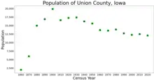 Union County is a county located in the southern part of the U.S. state of Iowa. As of the 2020 census, the population was 12,138.[1] The county seat is Creston.[2] Organized at a time of tensions before the Civil War, the county was named in 1853 for the union that people wanted to preserve. The rural county's peak of population was in 1930. Its economy is based on agriculture and related industries. Creston and the county are still served by the Burlington Northern Santa Fe Railroad (BNSF), the largest network in the nation.