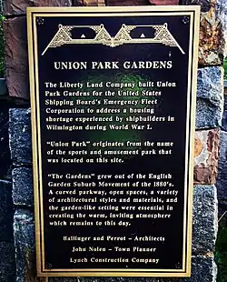 Union Park Gardens is a neighborhood located between Union Street and Lancaster Avenue in Wilmington, Delaware, United States. It was designed by landscape architect John Nolen and the architect Emile G. Perrot of the firm Ballinger & Perrot during the First World War.[1][2] Union Park Gardens first served as housing for shipyard workers of the United States Shipping Board's Emergency Fleet Corporation.[3]