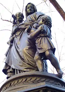 Union Square Drinking Fountain, also known as James Fountain, is an outdoor bronze sculpture and ornamental fountain by sculptor Adolf von Donndorf and architect J. Leonard Corning, located on the west side of Union Square Park in Manhattan, New York City. Cast in 1881 and dedicated on October 25, 1881, it was donated by Daniel Willis James "to promote public health as well as the virtue of charity".[1] The statuary group includes a standing woman holding a baby in her right arm and a young child at her left side. They are set on an octagonal Swedish red granite pedestal with lion head fountains and basins on four of the sides.[1]