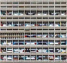 Unité d'Habitation of Berlin (The name given by Le Corbusier is Unité d'habitation "Typ Berlin") is a 1958 apartment building located in Berlin, Germany, designed by Le Corbusier following his concept of Unité d'Habitation.[1] Le Corbusier's Unité d'Habitation concept was materialised in four other buildings in France with a similar design. The building is constructed in béton brut (rough-cast concrete) and is part of the initial architecture style we know today as brutalism. The structure was built with on site prefab cast concrete panels and poured ceiling slabs. The Modulor system is the base measure of the Unité and Corbusier used not more than 15 Modulor measures to construct the entire structure form. Ultimately the work has been eliminated from Le Corbusier's oeuvre,[2] which he confirmed[3][4] himself until his death in 1965 and which has also been confirmed posthumous in 1967 in his last authorized publication of his work.[5]
