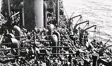 Ashantian had survived an earlier attack by U-137[18] on 26 September 1940, when, as part of Convoy OB 218, she was hit amidships on the port side by a single torpedo. It disabled the ship, killing four crew members on watch in the engine room. Both port lifeboats had been destroyed, and the 38 surviving crew members immediately abandoned ship using only the starboard 2 lifeboats, but one of them swamped, so all had to board the single remaining lifeboat. At daylight they reboarded the vessel, recovered the swamped lifeboat and sent distress signals to a circling aircraft. The commander of the Flower-class corvette HMS Gloxinia ordered the crew to leave the vessel again because a U-boat was reported in nearby Dromore Bay. On 27 September 1940, the master and crew were returned to the vessel where she was towed to Rothesay by tugs HMS Superman and HMS Seaman. She was beached in Kames Bay on 30 September 1940. In May 1941 the ship was refloated and towed to Glasgow, where she was repaired and returned to service in September 1941.