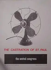 The Congress' most notable public show was The Castration of St. Paul, at the Nickle Arts Museum[5] on the University of Calgary campus in February/March, 1991.[6] Castration was intended to critique what The United Congress called the patriarchal nature of Christianity, and the show created "a virulent reaction" in the local press.[7] "The Castration of St. Paul" featured thirty low-resolution colour xerox enlargements of Polaroid photographs of naked male torsos. Each enlargement was carefully framed and labeled with the name of a historic Christian religious figure, including the twelve Apostles, seven Old Testament Prophets, five early Christian Saints, the Trinity, John the Baptist, Martin Luther, and Pope John Paul II.[8] Also part of the exhibit was a public lounge area featuring select pamphlets and literature promoting Christian organizations who espoused traditional values which the collective considered to be encouraging the subordination of females in family and public life.[8]