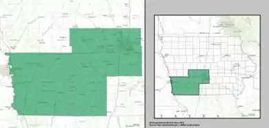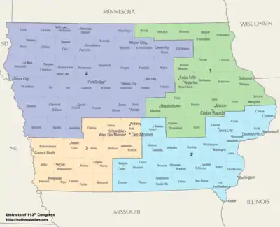 List of members of the Iowan United States House delegation, their terms in office, district boundaries, and the district political ratings according to the CPVI. The delegation has a total of 4 members, including 3 Republican and 1 Democrat.