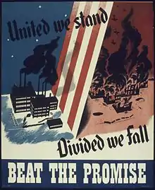 - Winston Churchill, June 16, 1941 used the phrase "United we stand. Divided we fall" in a broadcast from London to the US on receiving an Honorary Degree from the University of Rochester[6]