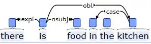 This analysis identifies there as an expletive (expl), food as a nominal subject (nsubj), kitchen as an oblique object (obl), and in as a case marker (case) -- there is also a dependency connecting the to kitchen, but it is not shown. Note that the copula is in this case is positioned as the root of the sentence, a fact that is contrary to how the copula is analyzed in the second example just above, where it is positioned as a dependent of the root.