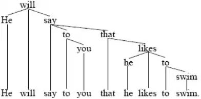 This example is taken from the article here.[8] An alternative convention for showing dependencies is now used, different from the convention above. Since the syntactic functions are not important for the point at hand, they are excluded from this structural analysis. What is important is the manner in which this UD analysis subordinates the auxiliary verb will to the content verb say, the preposition to to the pronoun you, the subordinator that to the content verb likes, and the particle to to the content verb swim.