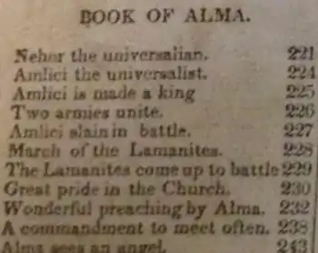 In about 83 BCE, the prophet Alma went and preached in a city of Ammonihah, whose people followed the teachings of Nehor.[48] A lawyer named Zeezrom debates Alma and his friend Amulek using a Universalist line of questioning. Zeezrom asks Amulek, "Shall [the Son of God] save his people in their sins?" Amulek answers, "The Lord surely shall come to redeem his people; but he should not come to redeem them in their sins, but to redeem them from their sins." Zeezrom turns to the people and says, "[Amulek] saith that the Son of God shall come, but he shall not save his people-as though he had authority to command God." Amulek accuses Zeezrom of misrepresenting his words and clarifies, "I say unto you again that he cannot save them in their sins; for I cannot deny his word, and he hath said that no unclean thing can inherit the kingdom of heaven; therefore, how can ye be saved, except ye inherit the kingdom of heaven? Therefore, ye cannot be saved in your sins." Alma and Amulek continue by expounding the doctrine that only those that believe and follow Jesus will be redeemed.[49][50]
