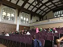Known as Conron Hall, (formerly known as Convocation Hall) the main auditorium showcases the architectural design of the collegiate gothic style. The hall is a large space, with 650 seats. Seats span the main floorspace as well as a balcony. The stained glass windows are seen all throughout the hall, as well as the oak panelling and oak beam construction.