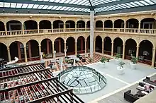 Inside it has a square Renaissance courtyard with two floors connected by a monumental staircase. The central courtyard is surrounded by double arches supported by columns of smooth shafts.[8]