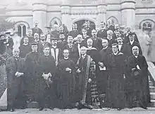 Provost Thomas C. S. Macklem succeeded Welch in 1900, and entered office in favour of federation with the University of Toronto.[60] In a newspaper interview, Reverend Macklem declared that "the time has come when neither the University of Toronto nor Trinity University can afford to stand aloof from one another any longer without sacrificing a great national ideal."[61] Macklem was Trinity's first Canadian-born Provost, and proved an ardent reformer, who quickly banned beer and hazing over the strong opposition of the student body.[62] In 1901, the Provincial Legislature amended the University of Toronto Act to facilitate a possible federation with Trinity.[63] Trinity celebrated its fiftieth anniversary in 1902, still an independent university, but undergoing negotiations with the University of Toronto on federation. To mark the occasion, Trinity conferred honorary degrees to Premier George William Ross, and renowned physician William Osler.[64] The next year, after what Macklem described as a "long-drawn and bitter" series of debates, the College Corporation voted 121 to 73 in favour of federation with the University of Toronto.[65][60][66] Opponents of federation sought a judicial injunction against the agreement, but were unsuccessful. The University of Toronto made a concession to allow Trinity to grant its own degrees in theology, which required the university to remove the restriction from its governing charter.[60]