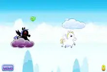 Unpleasant Horse is a side-scrolling platform game developed by 4th and Battery for iOS,[2] a subsidiary of PopCap Games.[3] The protagonist of the game is a black "horse" (though technically a pegasus), which the user must direct across the level by having the horse bounce on clouds, and on the backs of white horses. This causes the white horses to fall onto meat grinders at the bottom of the level; if the user misdirects the black horse when trying to hit a cloud or a white horse, then the black horse itself falls onto the meat grinders.[2]