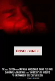 Unsubscribe is a 2020 horror film created by filmmaker Christian Nilsson and YouTuber Eric Tabach.[8] It stars Tabach, Charlie Tahan and YouTuber Michelle Khare,[3] and other successful YouTubers like Thomas Brag and Zach Kornfeld.[9] The 29-minute film[6] follows five famous YouTubers who are tricked into joining an online call, only to find themselves stalked and hunted by an internet troll on camera.[5][3]