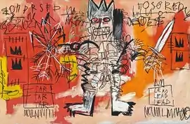 Executed in 1981, Untitled depicts a regal warrior surrounded by texts and graffiti imagery that marks his "transcendence from the leading figure on the underground art scene to the established world of international art stardom."[2] The year it was created, Basquiat had his first solo exhibition at Galleria d'Arte Emilio Mazzoli and Annina Nosei became his first art dealer.[3][4] Describing his aesthetic, she said his paintings "had a quality you don't find on the walls of the street, a quality of poetry and a universal message of the sign. It was a bit immature, but very beautiful."[5] Nosei provided Basquiat with studio space in the basement of her gallery, along with paint and canvases as he worked towards his first American solo show.[3] Art collector Anita Reiner, saw the painting while Basquiat was working on it and purchased it on the spot.[6] Reiner died in 2013, and the painting remained in the Reiner Family Collection until her heirs put it up for auction in 2014.[7][8] It sold for $34.8 million at Christie's Post-War and Contemporary Art Evening Sale in May 2014.[1]