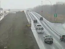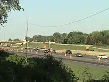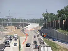 2006 brought a beginning to the rebuilding of Interstates 35E and 694. Beginning in May 2006, bypasses and detours of interstate traffic were set up along both interstates, first covering the total distance of the project on both interstates, and a retaining wall along NB 35E was also started from Little Canada Road to the west junction of Interstates 35E and 694.[5] Construction of two bridges on both the east end of the project and the west end of the project continued through June 2006, and noise walls were beginning to be installed along SB Interstate 35E to the east end of the commons section.[6] This continued into August, and flyover bridge construction continued going from NB Interstate 35E to WB Interstate 694 on the west end of the project. Noise wall construction in two areas of the project were completed by the early part of September,[7] and permanent pavement was beginning to be poured from Ramsey County Road E to Interstate 694 on the east end of the project, and from Little Canada Road to Interstate 694 on the west end of the project.