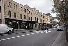 Unwin's Stores comprise a row of sandstone commercial buildings, originally with residences over, fronting George Street. These five sandstone buildings, originally built as shops and dwellings, were erected by Frederic Wright Unwin between 1843 and 1846. They were constructed during a depression in the Colony's economy, in the decade prior to the discovery of gold. Thus, their architectural style reflects not only the prevailing style, Colonial Georgian, but also the relative austerity of the area during this period.[15]