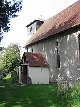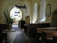 No church was mentioned at Marden in the Domesday Survey, only those at Compton and Stoughton. Before 1121 however Up Marden church had been given, along with Stoughton church, to Lewes Priory by Savaric fitz-Cane.[16] St Michael's Church stands 500 feet (150 metres) above sea level on a ridge where it is approached along a farm track. Described by Ian Nairn as having one of the loveliest interiors in England the church is all of 13th century construction. The triangular chancel arch between chancel and unaisled nave is a 16th-century repair to the original 13th-century arch. The walls and wagon roofs are plastered and the floors of brick. The windows are large simple lancets, with the east window consisting of three together under a rere-arch. The tower has a weatherboarded bell chamber. The chancel contains a trefoil headed piscina. A more recent feature for such an ancient church is the Victorian stone pulpit with ogee-panelled sides which, in Nairn's opinion, fits in perfectly.[17] In 1628 a bell was cast for the church by bell founders Thomas Wakefield and Bryan Eldridge.[18] There were also two other bells, one dated 1620 and one unmarked, but all three have been taken down because of weakness in the bell tower.[5]