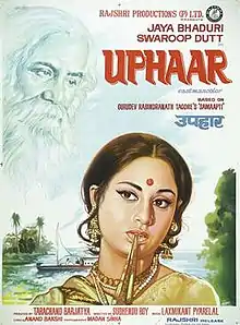 Uphaar is a 1971 Hindi film. Produced by Tarachand Barjatya for Rajshri Productions, the film stars Jaya Bhaduri, Swarup Dutta and Kamini Kaushal. The music is by Laxmikant Pyarelal. This film is based on the 1893 short story "Samapti" (The End) by Rabindranath Tagore. The film was selected as the Indian entry for the Best Foreign Language Film at the 45th Academy Awards, but it was not nominated.[1] Following years this movie dubbed in various south Indian languages including successful in Malayalam as Upaharam in 1972.[2] "Samapti" was earlier made into a Bengali movie by Satyajit Ray and is a part of his trio of short films released as "Teen Kanya".
