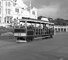 After the closure of the line, two of the cars, No. 72 and No. 73 were turned into a bungalow at Jurby. Both vehicles retained their bogies.[7] They had been built by G. F. Milnes in 1896. In 1968, these two vehicles were rescued by the Douglas Cable Car Group, and a restoration was carried out between then and 1976, using the best of both cars. The tram now bears the number 72 on one end and 73 on the other, it has been converted to work by battery power and is sometimes seen running on the horse tramway.[2]