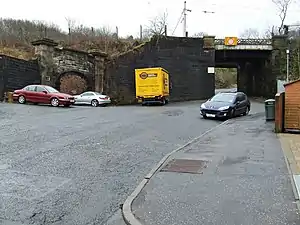 ![]() The bricked-up entrance to the old Upper Greenock station. | |