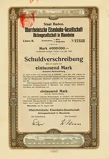 In order to carry out the electrification of the line and to allow the expansion of its tram network, the city of Mannheim in cooperation with the SEG, which had acquired the Mannheim-Weinheim-Heidelberg-Mannheim railway, founded the Oberrheinische Eisenbahn-Gesellschaft AG (OEG) in 1911. In order to prevent domination by the RWE, the city of Mannheim held a majority of the shares of the company.[1] The Schwetzingen–Ketsch Tramway (Straßenbahn Schwetzingen–Ketsch) and two power plants in Ladenburg and Rheinau were acquired by the OEG. 51% of the share capital was held by the city of Mannheim and 26% by the SEG. The rest was accounted for by three other shareholders. The OEG took over the operation of the lines on 1 April 1911.[2]