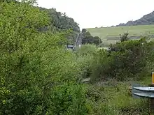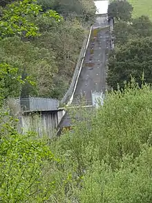 A new earth-filled dam was constructed in 1977, directly downstream of the old one, to provide protection against earthquakes.[6] The new dam is 182 feet (55 m) high and 1,300 feet (400 m) long, containing 88,890 cubic yards (67,960 m3) of material.[2]