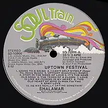"Uptown Festival" is the first single credited to the band Shalamar, released on Soul Train Records in 1977. The song is a medley of ten Motown classics sung over a 1970s disco beat. The radio edit, "Uptown Festival (Part 1)," became a hit peaking at No. 25 on the Billboard Hot 100, No. 10 on the R&B chart and No. 2 on the Dance chart. It also charted internationally. After the success of the single, Dick Griffey, the booking agent for Soul Train, formed a vocal group, resulting in the first incarnation of Shalamar with Jody Watley, Jeffrey Daniels and Gary Mumford.[1]