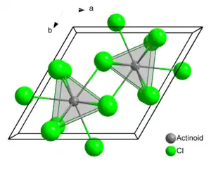 In solid uranium(III) chloride each uranium atom has nine chlorine atoms as near neighbours, at approximately the same distance, in a tricapped trigonal prismatic configuration.[3]
