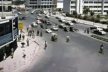 In September 1952, there were two significant policies promulgated at an urban development conference: "construction of key cities in co-ordination with the national economic development programme" and "establishment of urban planning structure to strengthen city development".[10] These policies influenced China's urban planning significantly and at the same time were clearly defined by the main direction of the state – centralised economic and industrial development. During the First Five-year Plan (1953–58), the nation determined to develop 156 national key projects and 8 key industrial based cities.[7] In this period, vast physical development projects such as industrial bases, community facilities and housing for workers were established to achieve national needs and goals. All of these projects were carried out with the aid of the experts from the Soviet Union, particularly in terms of urban economic development and physical urban design. Urban planning at that time was mainly based on Soviet planning principles and the model of the post-war Soviet planning practice. Soviet-style communist planning concentrated on "formalistic street patterns and grand design for public buildings and monuments, huge public squares, and the predominance of master plans".[11] The role of communist planners during this period was to focus on location selection of factories and industrial plants, arrangement of service facilities, design of the layout of industrial towns, functional division of urban land use zones and development of residential districts.[7][8] Historic preservation was not a priority during this period of development. For example, Mao Zedong allowed Beijing's city walls to be demolished despite their historical significance in order to make room for other uses.[12] The bricks from the walls were used in new development projects ranging from homes to a subway system. By the end of 1959, there were 180 cities, 1400 towns and more than 2,000 suburban residential settlements that had been project plans prepared under communist planning.[8]