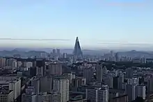 Although North Korea has not been a communist country since 2009,[5] Pyongyang, the capital of North Korea, has a downtown consisting of hundreds of high-rise apartments; however, most residents live in one-story buildings. North Korean citizens are provided housing by the government, and the quality of said housing is dependent on social status and household size.[6] The city also has several extraordinarily expansive public spaces that are usually built around colossal monuments depicting Juche ideologies and/or monuments relating to Kim Jong-il.