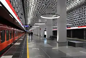 Urheilupuisto is unique among metro stations in Espoo, as it is not built into the bedrock.[5] The station platform is located at a depth of about 27 meters below street level. Urheilupuisto station was designed to operate with only one entrance (on the western side of the building) but, in response to passenger feedback, an entrance was constructed in the eastern side and opened on 29 February 2020.[6]