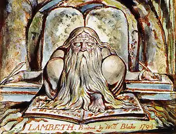 In the mythology of William Blake, Urizen (/ˈjʊrɪzən/) is the embodiment of conventional reason and law. He is usually depicted as a bearded old man; he sometimes bears architect's tools, to create and constrain the universe; or nets, with which he ensnares people in webs of law and conventional society. Originally, Urizen represented one half of a two-part system, with him representing reason and Los, his opposition, representing imagination. In Blake's reworking of his mythic system, Urizen is one of the four Zoas that result from the division of the primordial man, Albion, and he continues to represent reason. He has an Emanation, or paired female equivalent, Ahania, who stands for Pleasure. In Blake's myth, Urizen is joined by many daughters with three representing aspects of the body. He is also joined by many sons, with four representing the four elements. These sons join in rebellion against their father but are later united in the Last Judgment. In many of Blake's books, Urizen is seen with four books that represent the various laws that he places upon humanity.