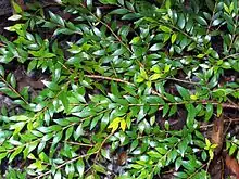 Leaves are opposite on the stem, narrow-elliptic with a prominent tip. 1.5 to 2.5 cm long, 0.3 to 0.7 cm wide.[2] Oil dots are small though easily seen under a lens. They are translucent and two to three diameters apart. The leaf stems are red and about 3 mm long. Leaf venation is obscure, with the mid rib only being easily seen.