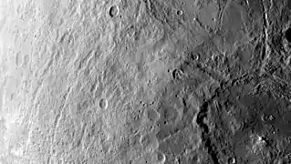 Urvara /ɜːrˈvɛərə/[1] উর্বর is the third-largest confirmed crater on Ceres after Kerwan and neighboring Yalode. Urvara means fertile. It is named after the ancient Indo-Iranian personification of fertility (plants in the Avesta, fertile fields in the Rig Veda).[2] It has a central peak, and a number of unexplained ridges intersect it.