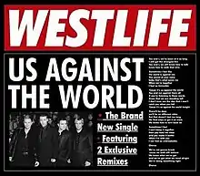 "Us Against the World" is a song by Irish boy band Westlife from their eighth studio album Back Home (2007). The song was released as the album's second single on 3 March 2008.