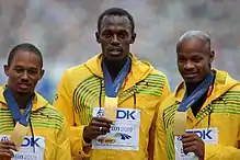 Bolt won a third consecutive world relay gold medal in the 4 × 100 metres relay final, which made him the most successful athlete in the 30-year history of the world championships.[208] The Jamaican team, featuring four of the top five from the 100 m final were comfortable winners with Bolt reaching the finish line on his anchor leg three tenths of a second ahead of the American team anchored by Gatlin.[209] Bolt's performances were matched on the women's side by Shelly-Ann Fraser-Pryce, meaning Jamaica took a complete sweep of the sprint medals at the 2013 World Championships.[208]