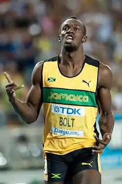 Usain St. Leo Bolt, OJ, CD, OLY (/ˈjuːseɪn/;[12] born 21 August 1986) is a retired Jamaican sprinter, widely considered to be the greatest sprinter of all time.[13][14][15] He is the world record holder in the 100 metres, 200 metres, and 4 × 100 metres relay.