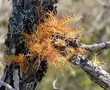 Usnea rubicunda, commonly known as the red beard lichen, is a type of arboreal lichen native to temperate regions in North, Central and South America, as well as Europe, Eastern Asia, and North Africa. This fruticose species forms hair-like hanging clusters that are orange to red in color. It is at risk of extirpation in Canada.[1]