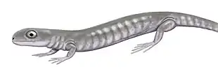 Utaherpeton is an extinct genus of lepospondyl amphibian from the Carboniferous of Utah. It is one of the oldest and possibly one of the most basal ("primitive") known lepospondyls. The genus is monotypic, including only the type species Utaherpeton franklini. Utaherpeton was named in 1991 from the Manning Canyon Shale Formation, which dates to the Mississippian-Pennsylvanian boundary.[1] It was originally classified within Microsauria, a group of superficially lizard- and salamander-like lepospondyls that is now no longer considered to be a valid clade or evolutionary grouping, but rather an evolutionary grade consisting of the most basal lepospondyls. Utaherpeton has been proposed as both the most basal lepospondyl and the oldest "microsaur", although more derived lepospondyls are known from earlier in the Carboniferous. However, its position within Lepospondyli remains uncertain due to the incomplete preservation of the only known specimen. The inclusion of Utaherpeton in various phylogenetic analyses has resulted in multiple phylogenies (hypotheses of evolutionary relationships) that are very different from one another, making it a significant taxon in terms of understanding the interrelationships of lepospondyls.