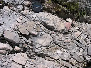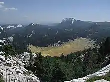 The Croatian mountain chain Velebit is probably the richest area in karstic uvalas of the Dinarides, Poljak (1951) cited by Ćalić (2009) p. 70. The breccia in this chain – there known as Jelar breccia – show very extensive outcropping.[24] These highly permeable carbonate breccias are a prominent feature of “Middle Eocene to Middle Miocene” age faulting activities in the Velebit area, Vlahovic et al. (2012). The deep incision of Velebit's most prominent uvala Lomska Duliba can be explained by the presence of the Jelar breccias, Ćalić (2009), p. 72.[25]