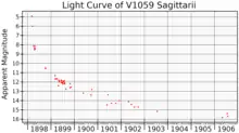 V1059 Sagittarii (also called Nova Sagittarii 1898) was a nova, which lit up in 1898[4] in the constellation Sagittarius. The star reached apparent magnitude 4.5, making it easily visible to the naked eye. It was discovered on 8 March 1898, by Williamina Fleming on a photographic plate taken at the Harvard College Observatory.[5] The discovery plate was an objective prism plate, part of the Henry Draper Memorial Photographs,[6] and Ms Fleming identified it as a nova based on its spectral characteristics.[7]