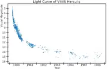 V446 Herculis was a nova in the constellation Hercules in 1960. It reached magnitude 2.8. The nova was first observed by Olaf Hassel in the early morning hours of 7 March 1960, when it was a 5th magnitude star. Pre-discovery photographs showed that it was about three days past peak brightness, and had faded by 2 magnitudes during that time. The star was so near the border between the constellations of Hercules and Aquila that accurate measurements of its position were needed to determine which constellation contained it.[4]