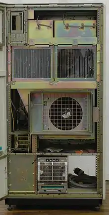 Below the card cages was the cooling system, which took up most of the volume in the cabinet. The bottom of the cabinet contained a provisions for an optional battery backup unit and two RA90 or RA92 hard disk drives. The battery backup unit could provide power to the system for one second in the event of a power failure, after which the system ceased to operate, but continued to preserve the data in the cache and memory for ten minutes.