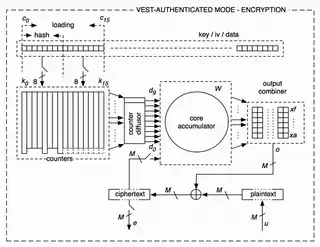 VEST ciphers consist of four components: a non-linear counter, a linear counter diffusor, a bijective non-linear accumulator with a large state and a linear output combiner (as illustrated by the image on the top-right corner of this page). The RNS counter consists of sixteen NLFSRs with prime periods, the counter diffusor is a set of 5-to-1 linear combiners with feedback compressing outputs of the 16 counters into 10 bits while at the same time expanding the 8 data inputs into 9 bits, the core accumulator is an NLPFSR accepting 10 bits of the counter diffusor as its input, and the output combiner is a set of 6-to-1 linear combiners.
