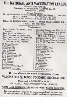 The National Anti-Vaccination League (NAVL) was a British anti-vaccination organization that was formed in 1896 from earlier smaller organizations. Historically, the League had opposed compulsory vaccination, particularly against smallpox. It was part of a wider anti-vaccinationist movement, arguing that vaccination did more harm than good.